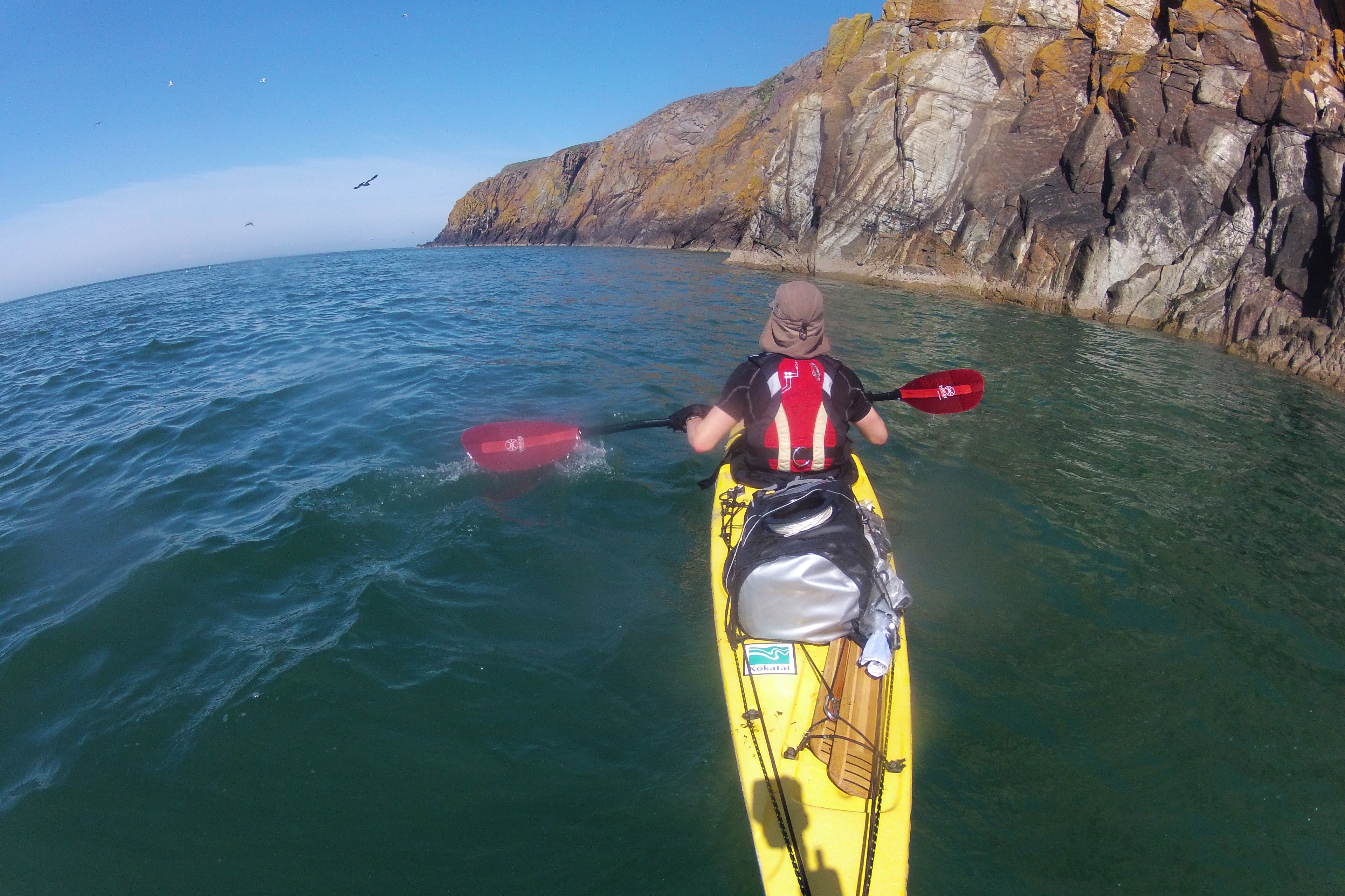 I was sucked onto the main artery of the current, a long tongue of turbulent water the sea boiled and turned upon itself as it shot out past the headland and out to the open ocean. This was the crucial moment, already moving at 15km/h I paddled as hard as I could to angle the boat across the race. I did not aim to fight it, simply track across and fight for the calm eddy circulating the very base of the mighty cliff face, if taken wrong or if heaven forbid I capsized I was on a one way express ride to the Isle of Man.