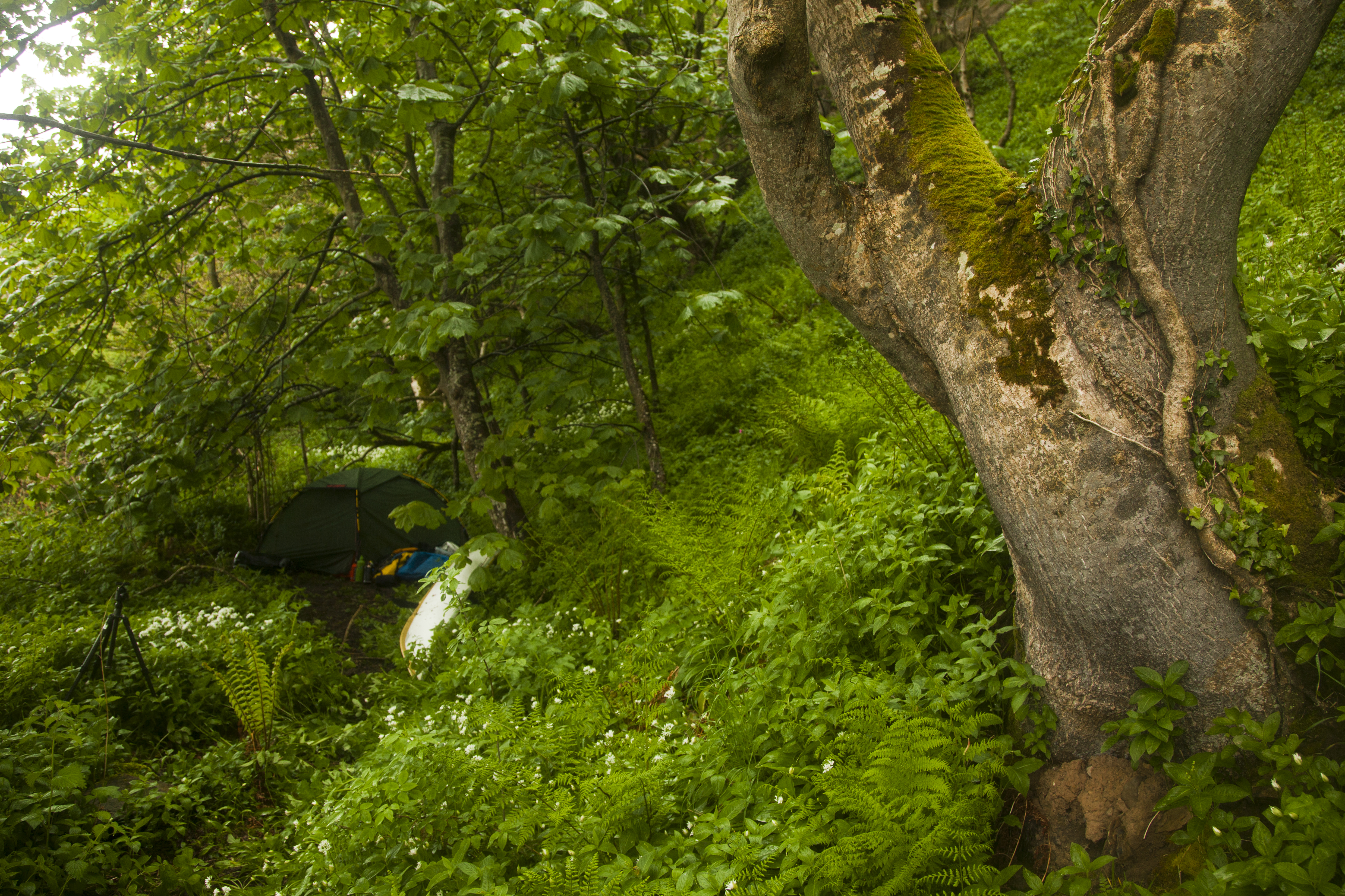 In the humid afternoon air an overpowering scent of wild garlic punched above all other senses, the luscious green sycamore, birch and alder with a thick undergrowth of garlic and ferns gave a distinctly tropical jungle atmosphere to the area. I sipped from a small tannin brown stream which gurgled beneath garlic leaves before clambering into the tent. An hour later I was cosy, dry and warm once more. With an excess of water I boiled large cups of steaming tea and a full litre mug of cheesy noodle slop a la’ freshly picked garlic leaves. . . Beat that Gordon Ramsey.