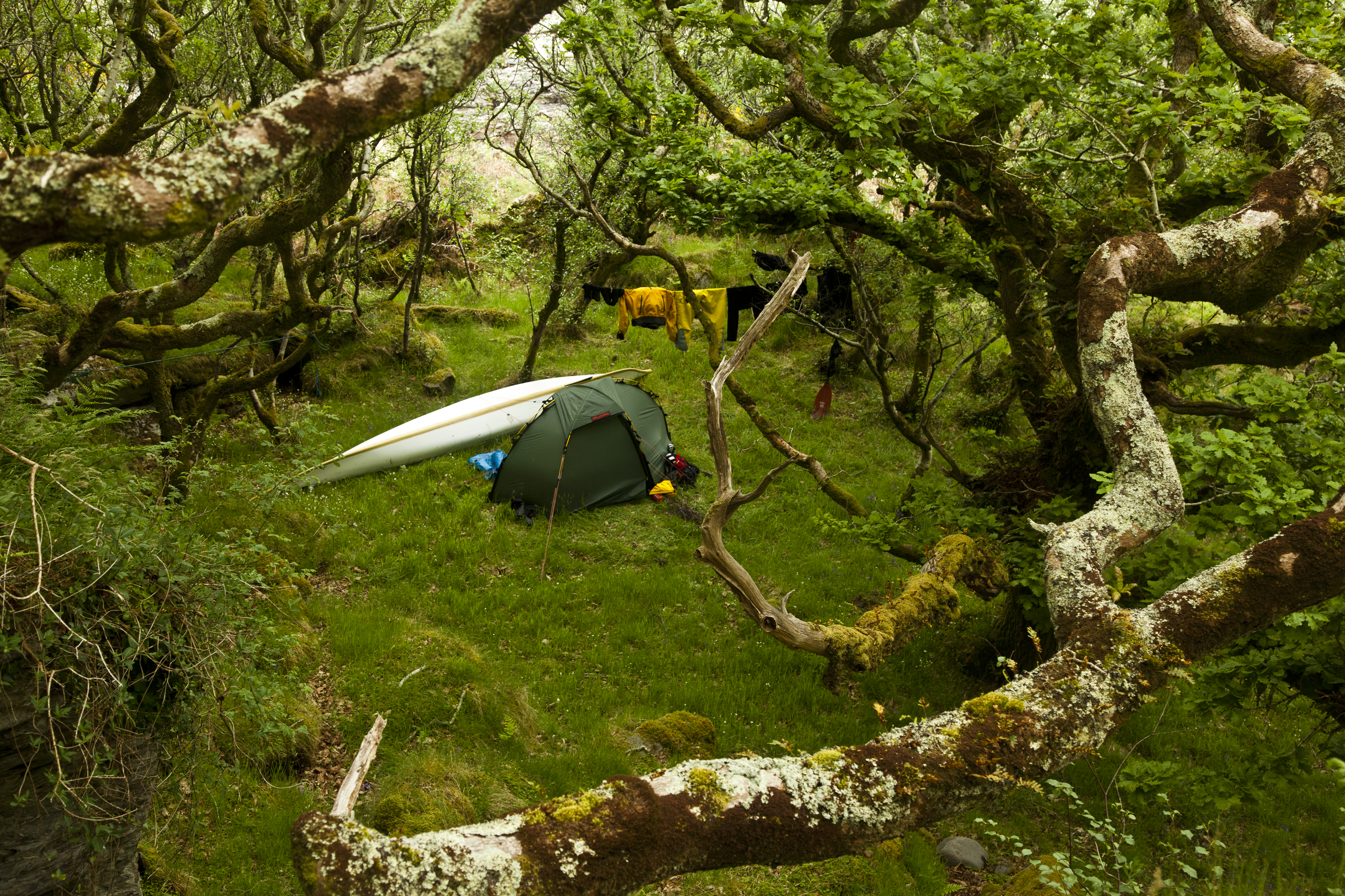 Dragging the boat to the top of the sand I carried my kit into a clearing in the woods. A very Tolkeinesk glade with jagged rocks dotted with ferns and a huge warped oak tree it seemed a great place to camp. A previous passer by had even rigged a fishing net hammock in a nearby branch.
