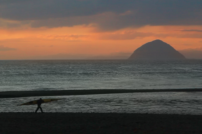 Escaping the surf at Ballantrae: (Film screen shot) Ailsa craig dominates the Horizon