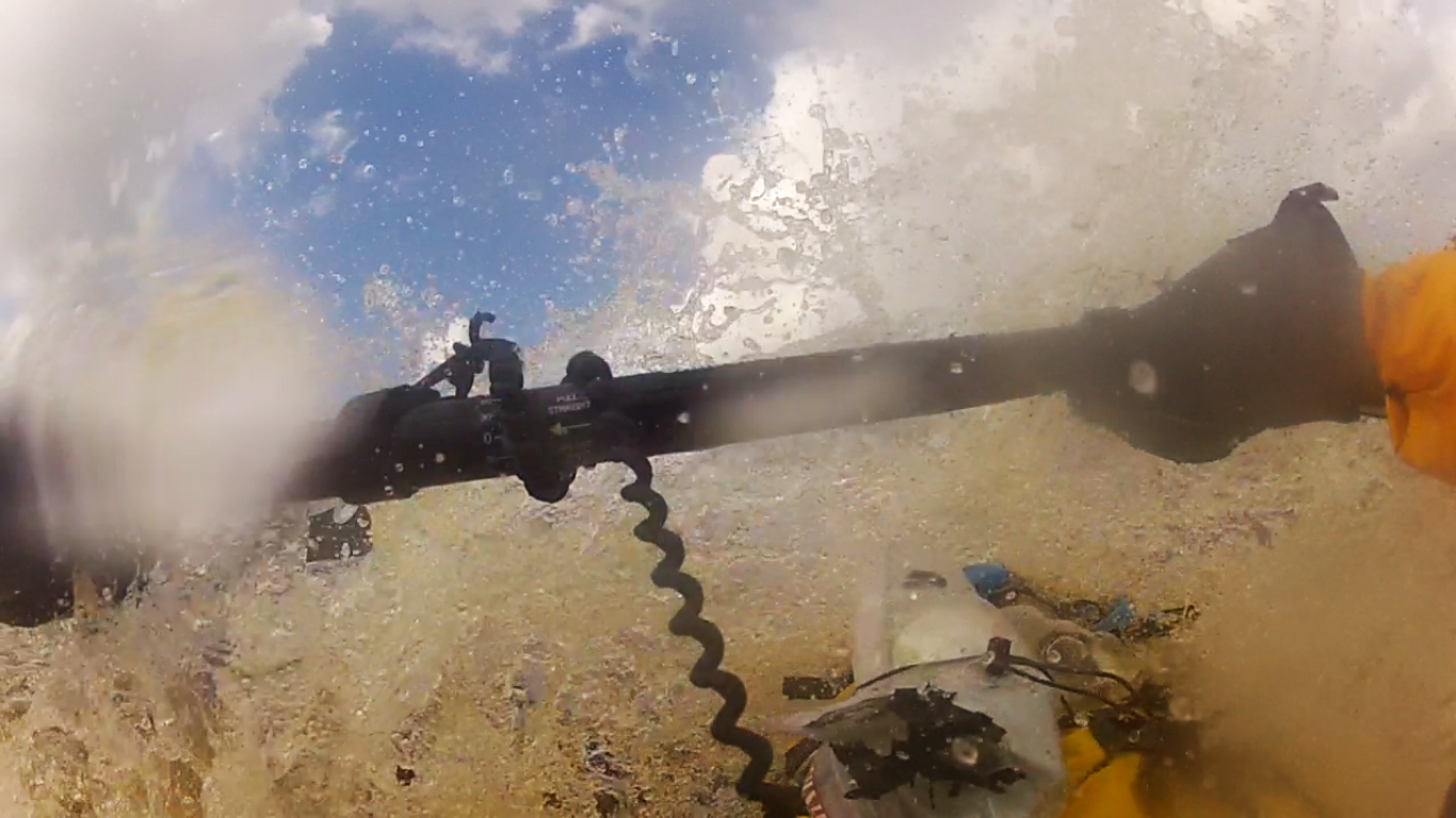 It took an hour the next morning to ‘repair’ the skeg. The wire was now back in but with a kink, something I could not fix. With a degree of forcing and jiggling back and forth it was possible to operate, this was good enough for the time being. I was more concerned about the imminent task of performing my first big surf exit in the fully laden boat. I have practiced these before but never in a full craft. Making a mistake could easily result in a broken boat or heaven forbid being knocked unconscious on the seabed below. Needless to say I was quite afraid.