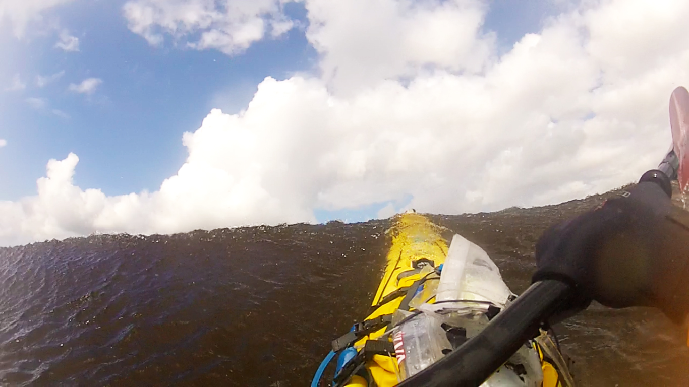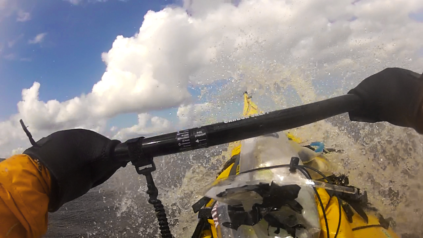 Fast approaching a wall of water swallowed the skyline, silent as the grave it towered above my bow, adrenaline surged through my veins. “THIS IS NOT GOOD!!!” driving the paddle in frantic desperation I reared up onto the face of the wave, surely it would collapse and take me with it. Time slowed. . . I could hear the roar of water, the thud of my heart in my ears, I expected at any moment the cold dark silence that followed capsizing into the freezing sea. The bow rose further pointing upward high into the sky, it broke the crest of the wave. To my left and right air filled the space around my blades where water should be, would I backflip? I braced hard and reaching over the lip of the wave drove a final powerful stroke behind the crest. To the cockpit I was suddenly airborne and a millisecond of total silence cut through the roar. With a whoop and an almighty crash the boat returned to the sea which parted around the hull with a colossal splash. I was shaking with adrenaline, what a rush! With the kick of energy I launched forward and escaped the break zone.