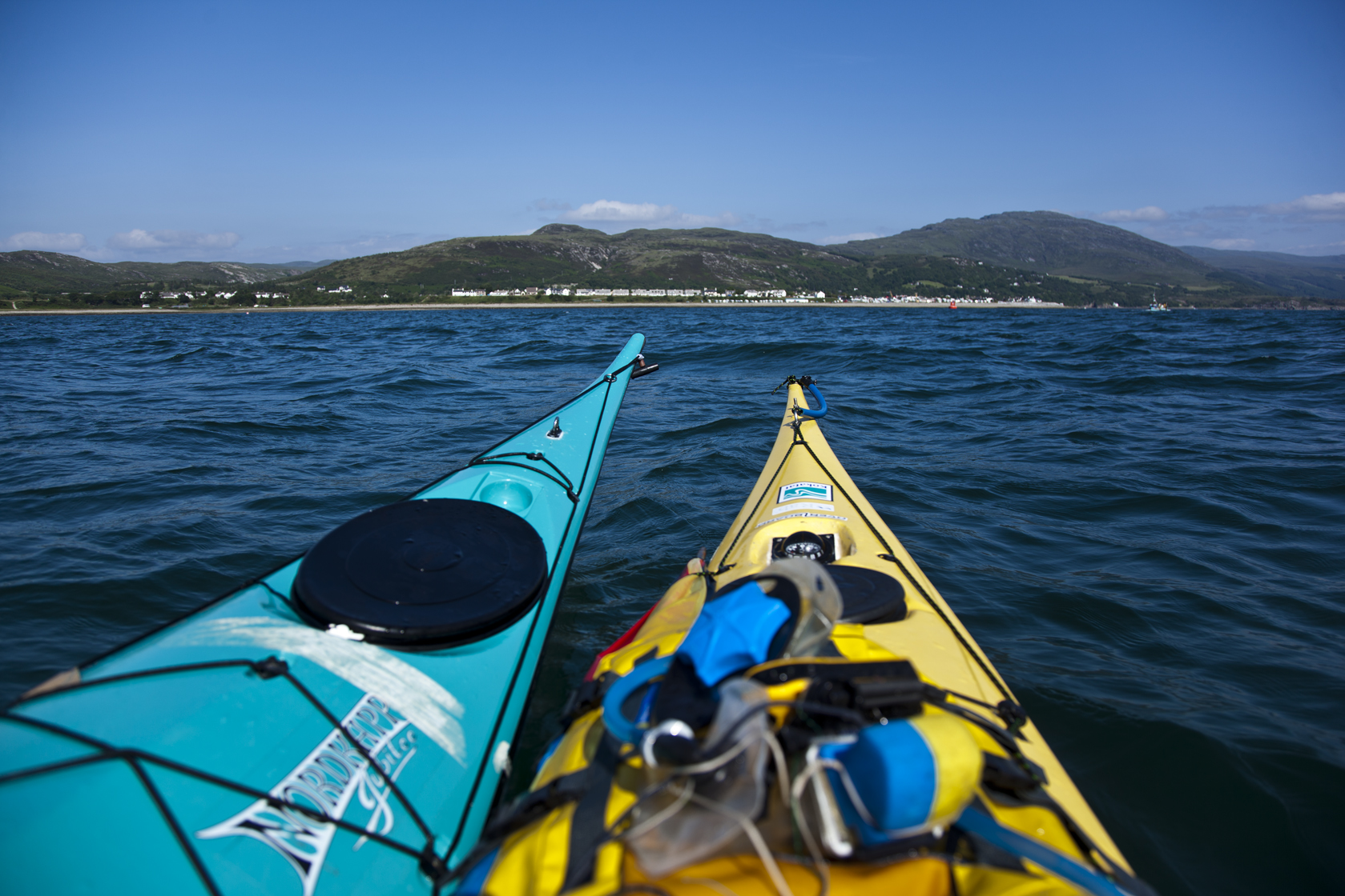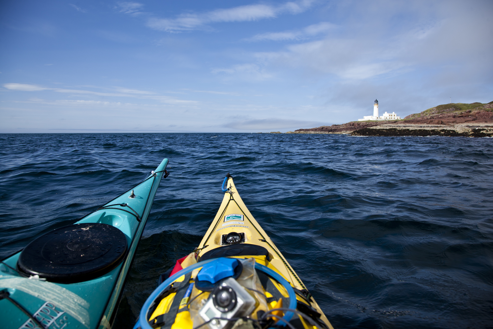 Smiling almost as brightly as the sun itself Tess paddled at my side, below my kayaks shadow chased me across the sand and Fulmars glided down from above, standing proud on the horizon at my bow the large white pillar of Rua Reidh lighthouse promised that camp was already close.