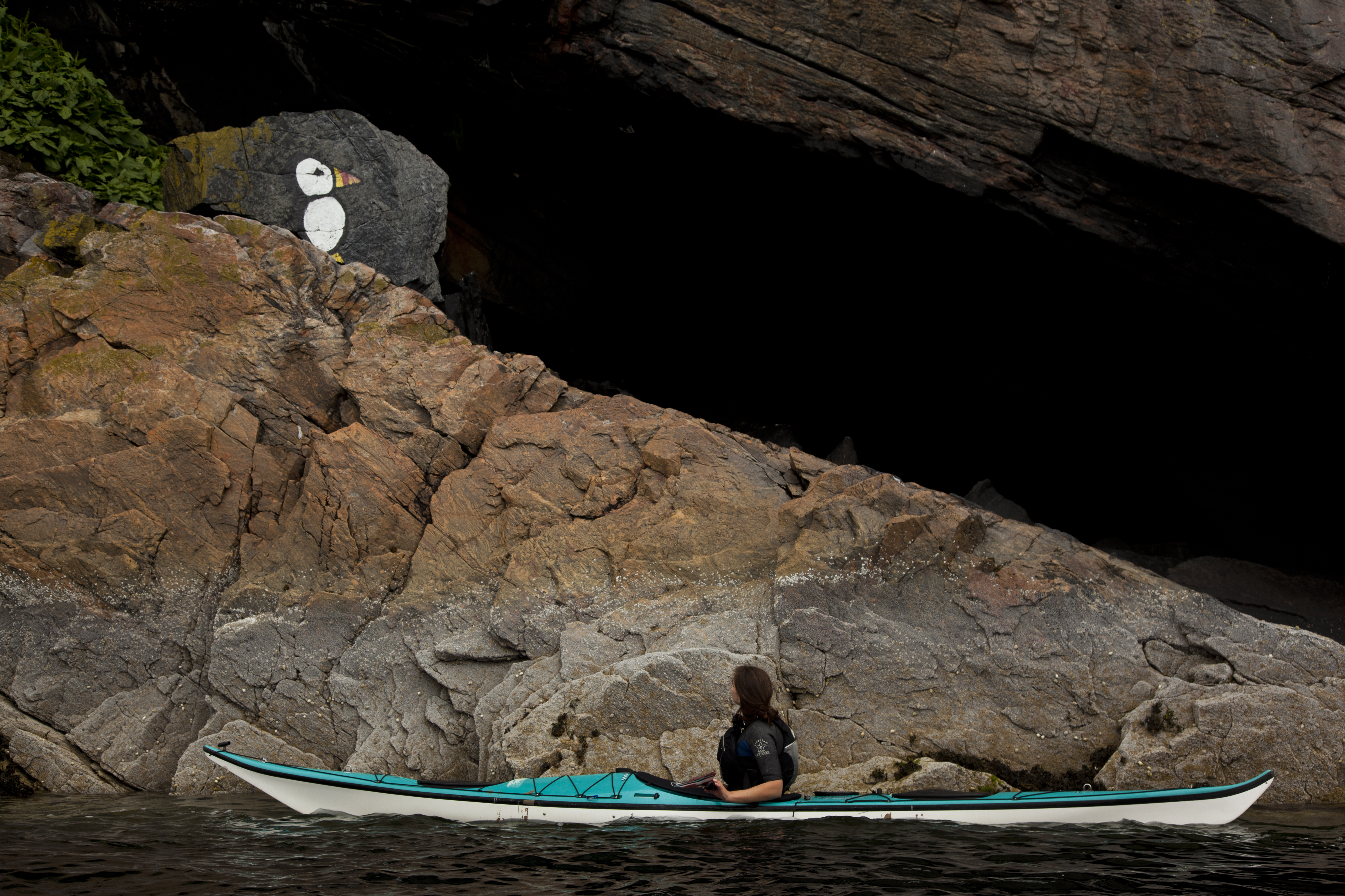 As Loch Torridon narrowed to the small inlet to Upper Loch Torridon we paddled close to the cliffs to avoid the slight tidal stream against us. From a small cave in the sandstone face a 2ft tall Puffin painted on a rock was nestled in the darkness. Perplexed and amused we couldn’t figure out how or why it was there…upon later asking locals the story of its creation seems clearer. “A tour boat painted it on…that way they can guarantee seeing a real wild puffin to their paying clients’ It seems they can be cheeky here on the west coast!