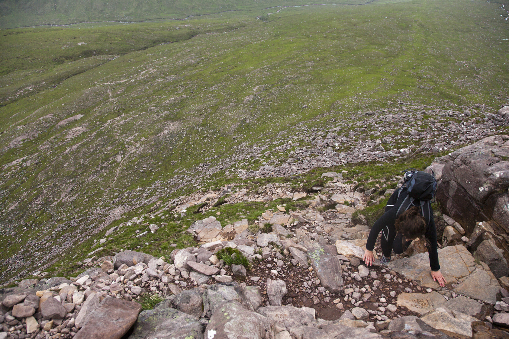 With the wind still howling Tess and I left the tents early in the morning and begun to push through thick bracken directly up the face behind our camp. Our aim was to summit the western peak of Liathach…in the gales there was no way we would brave the imposing scramble along the ridge.
