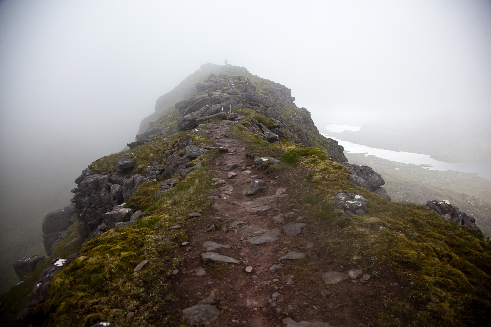Throwing on a jacket to avoid the worst of the mist I followed along the narrow ridge behind Tess who teetered along the wind sculpted blocks of 500 million year old rock. With a high five and a cheer we descended from the final horn onto a small col, we had only a long gradual ascent to go until the summit.
