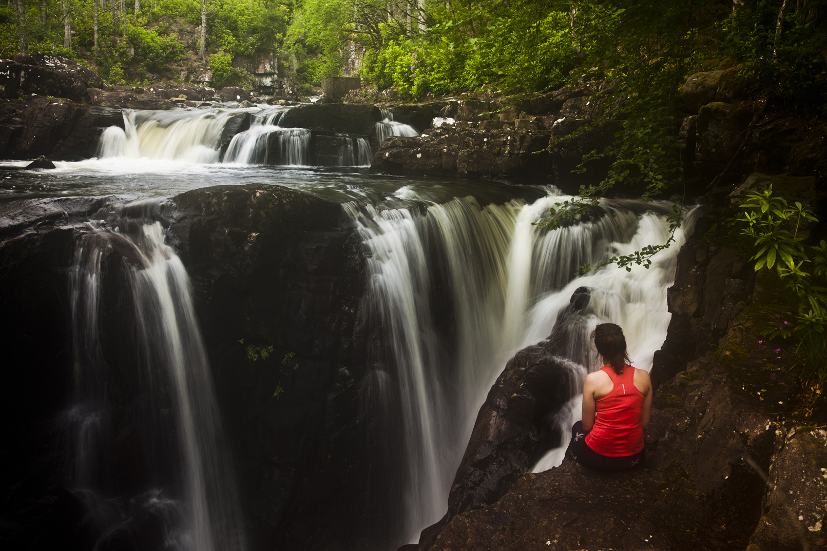 Hidden in the woods we relaxed in the dappled evening sunshine by a set of large cascading waterfalls. It felt good to simply enjoy the tranquility of the woodland, below the trees we were sheltered and only the rustle of branches and creak of trunks broke the silence.