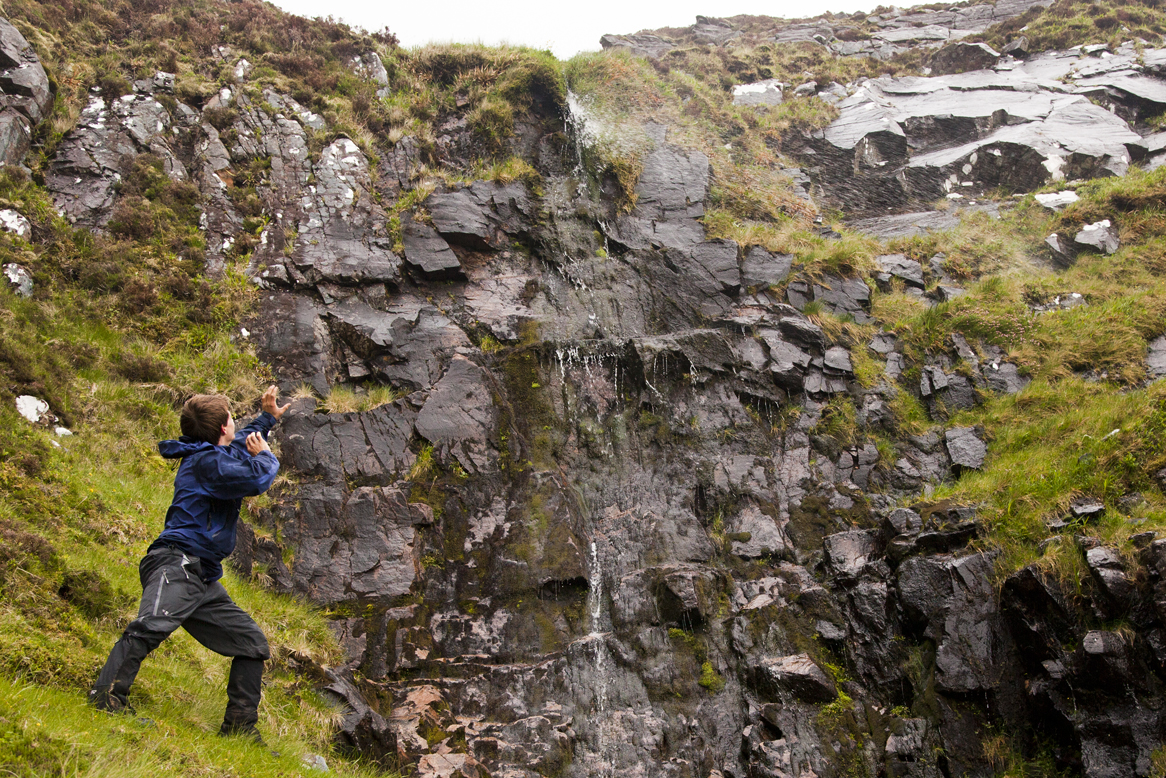 Sloping steeply upward the ascent seemed to pass relatively quickly. In the high winds we watched in awe as waterfalls fell only a few feet from the cliffs above before soaring skyward to whence they came.