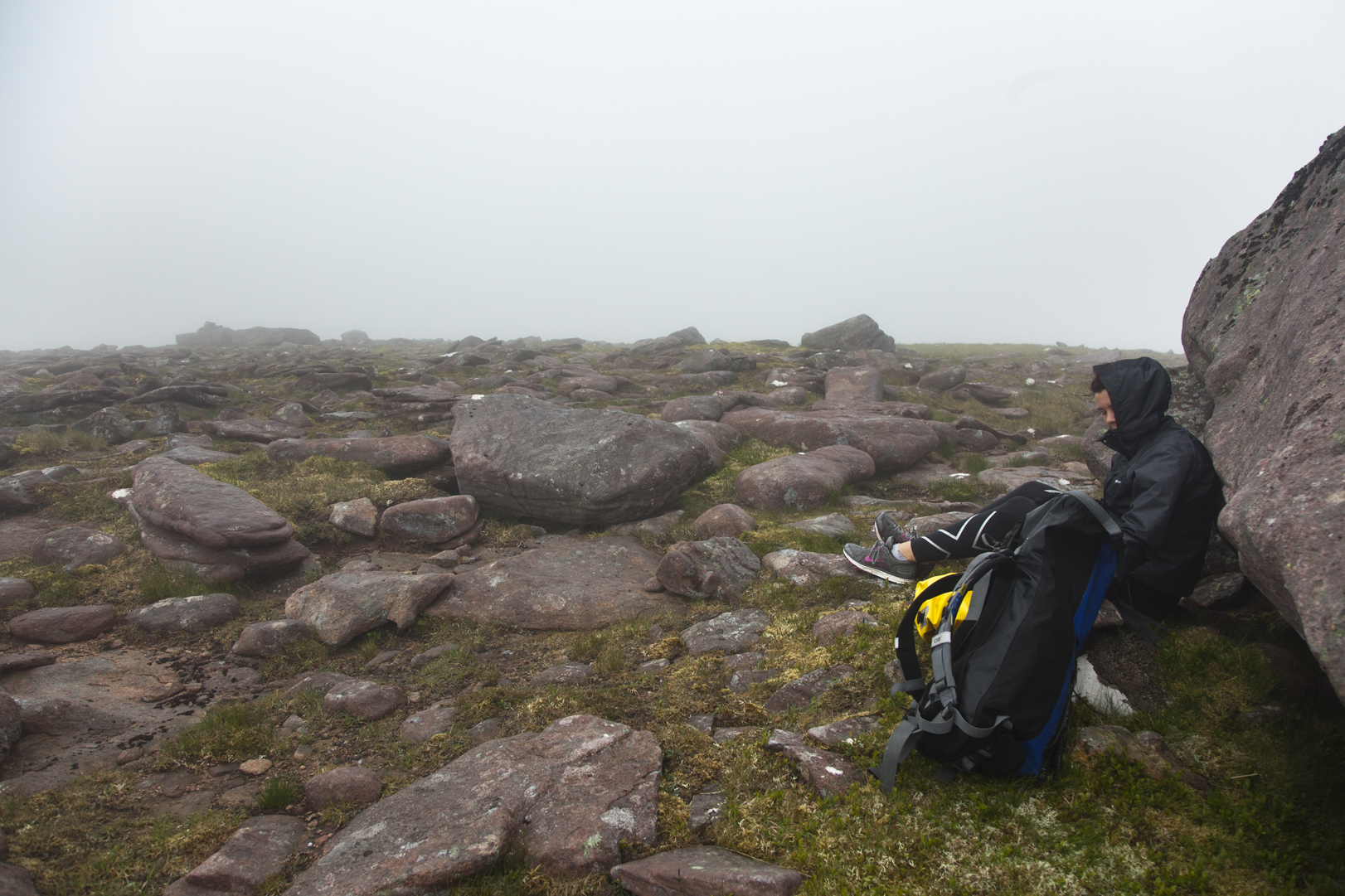 Below the clouds seemed to swallow the abyss, just 20m above a small cairn marked the end of our dreich ascent. It was a different feeling reaching the summit than the days before, this time there was no cheer or laughter just two cold souls ready to get back to the warmth of the shore. With a quick tap on the summit we turned back upon ourselves and headed fast toward the steep descent down.