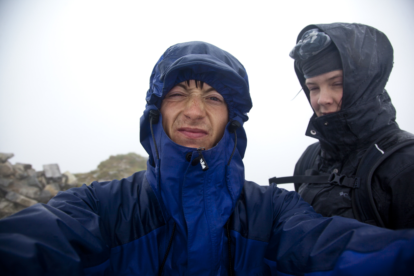 Meeting a solo hiker who was a member of the Mountain Rescue we joined his company to the second peak. Clearly he was a lot faster than us and soon disappeared ahead into the mist. We too were eager to summit and return to the shelter of camp. Briefly touching the second cairn we turned to descend.