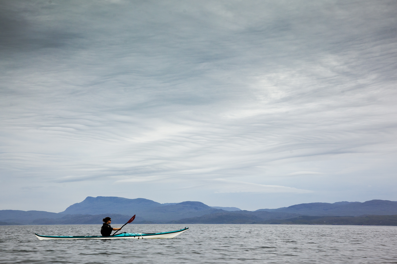 Warmed by the sun the sea was pleasant to paddle through and very inviting. We paddled together side by side past crags and wide stony beaches chatting about whatever came to mind. The sunshine was slowly being swallowed with incredible lenticular clouds which over the now clear Torridon mountains produced a spectacular vista behind us.