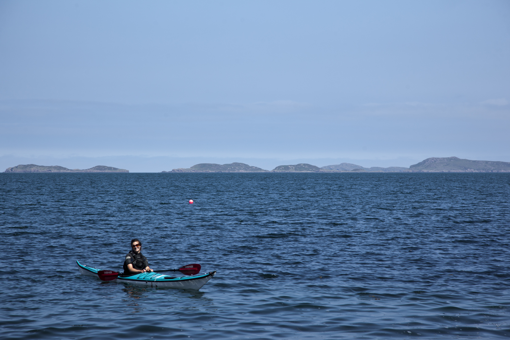 Heading out into a sea which normally would instil a nervous anxiety I was spurred with the comforting knowledge that should a capsize occur help wasn’t far behind. Paddling 2km west from the bay would be the hardest sea of the day. Rising in steep fetch which broke at eye level from the kayak the sea crashed across my deck. With the familiar boom of fibreglass on hard water I braced, bounced and rolled toward a small rocky outcrop.