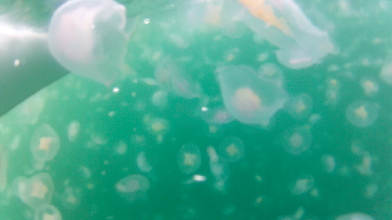 An incredible constellation of jellyfish swarmed below…like stars in a vast aqua green universe they drifted and pulsed with serene beauty. Mesmerised I realised the thuds on the blades had been strikes with the delicate organisms. I wondered if they were aware of my presence as I floated and ate an apple above their gelatinous galaxy.