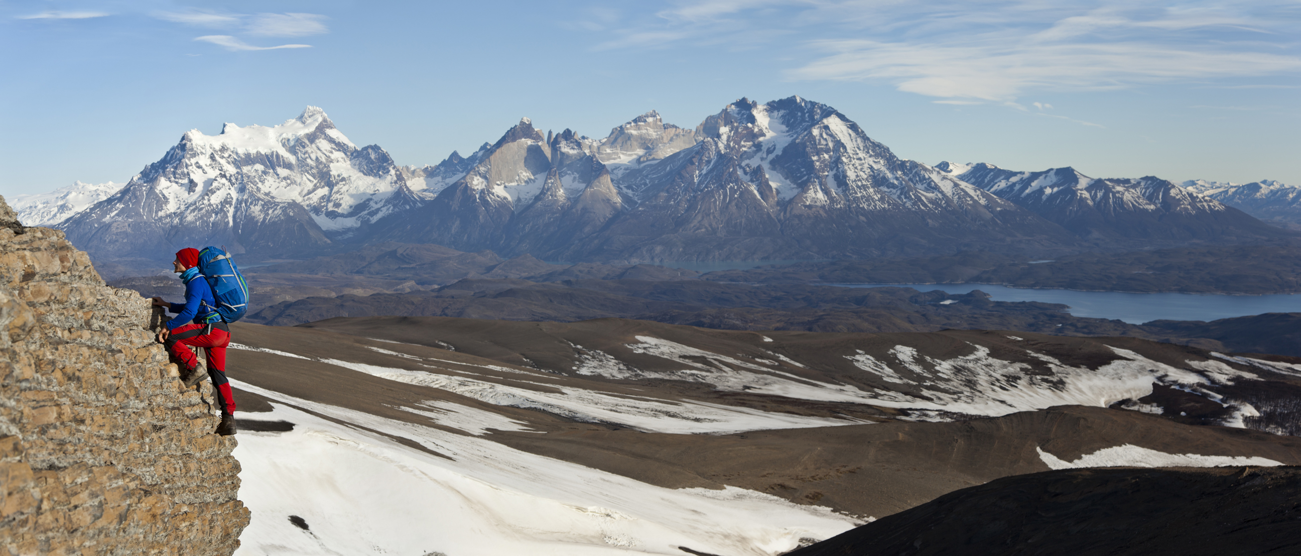 As quick as we had arrived into the forest we were soon rising once more into the barren world of the mountain summit. A land so scoured by wind and snow that few plants survive. Our trail now crunched not with ice but with shattered shale. The black rock baked under crystal skies. Our horizon dominated in a 360º panoramic of rock and ice. Cerro Toro: The mountain of the bull, to our side the Cuernos (horns) of Torres rose mighty above azul lakes.