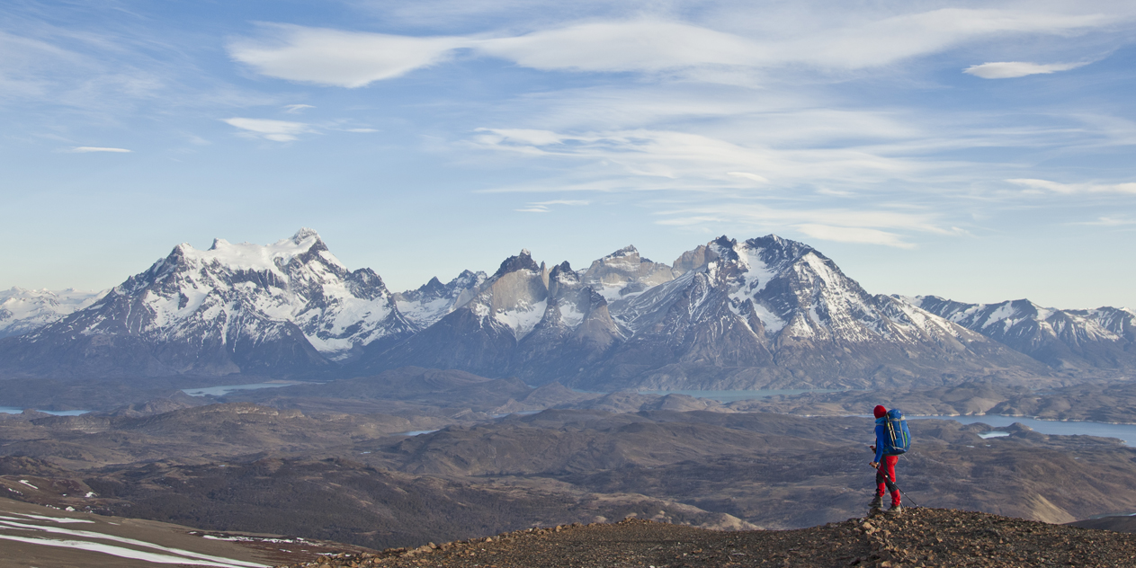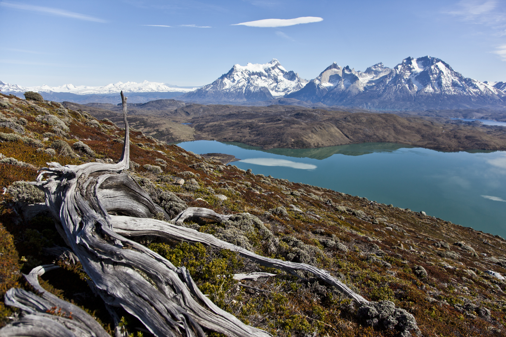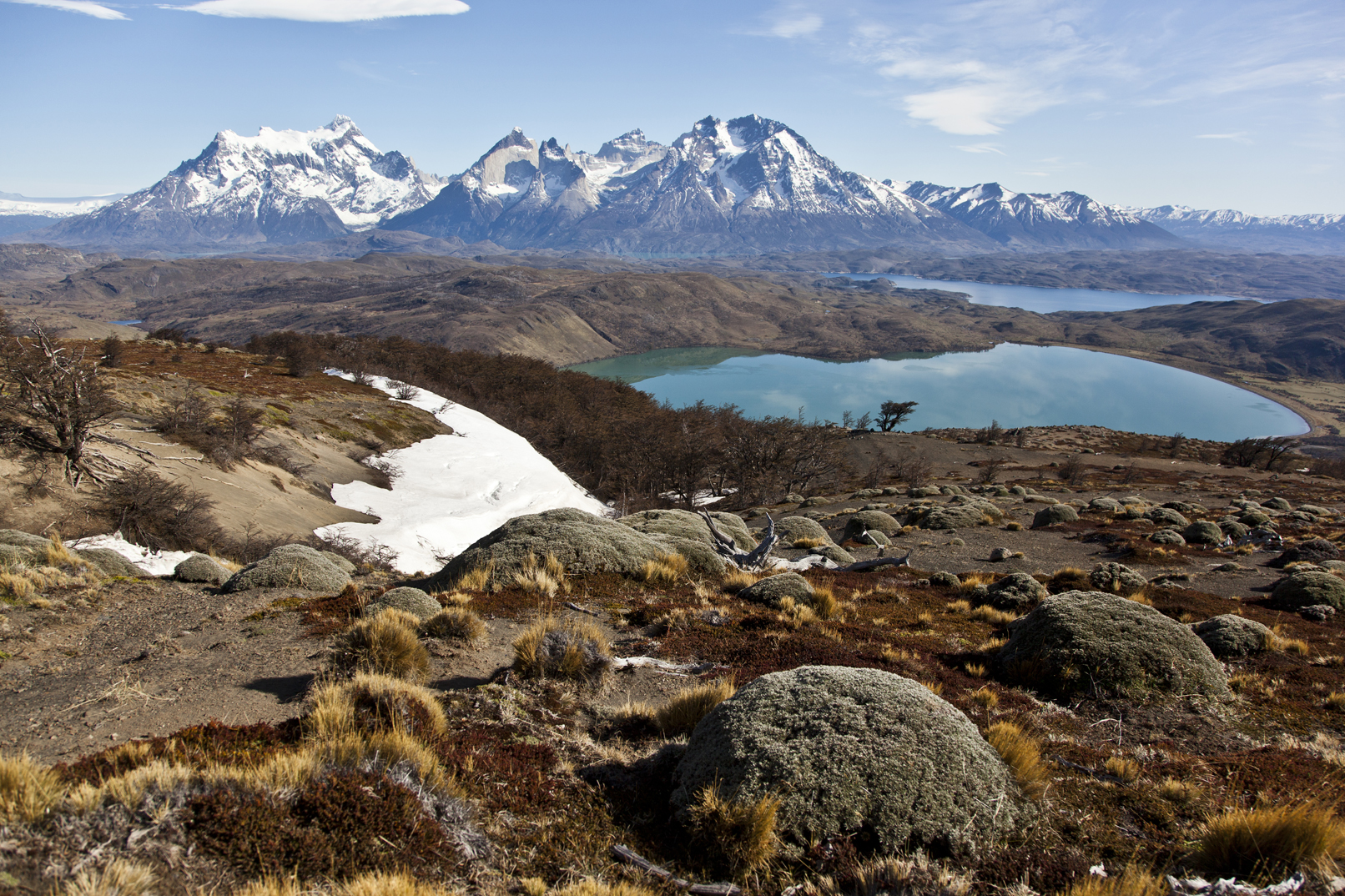 Sneaking past a condor which took flight on the mid-day thermals we descended back into forest to a world of colourful plants. The Mata bushes rising like spikey pillows dotted the shale between deep reds and yellows of the winter scarred alpine plants. Behind a vista of the entire Torres Del Paine range, the towers and walls of rock before a necklace of green, azul lakes. A finer view there is hard to find.