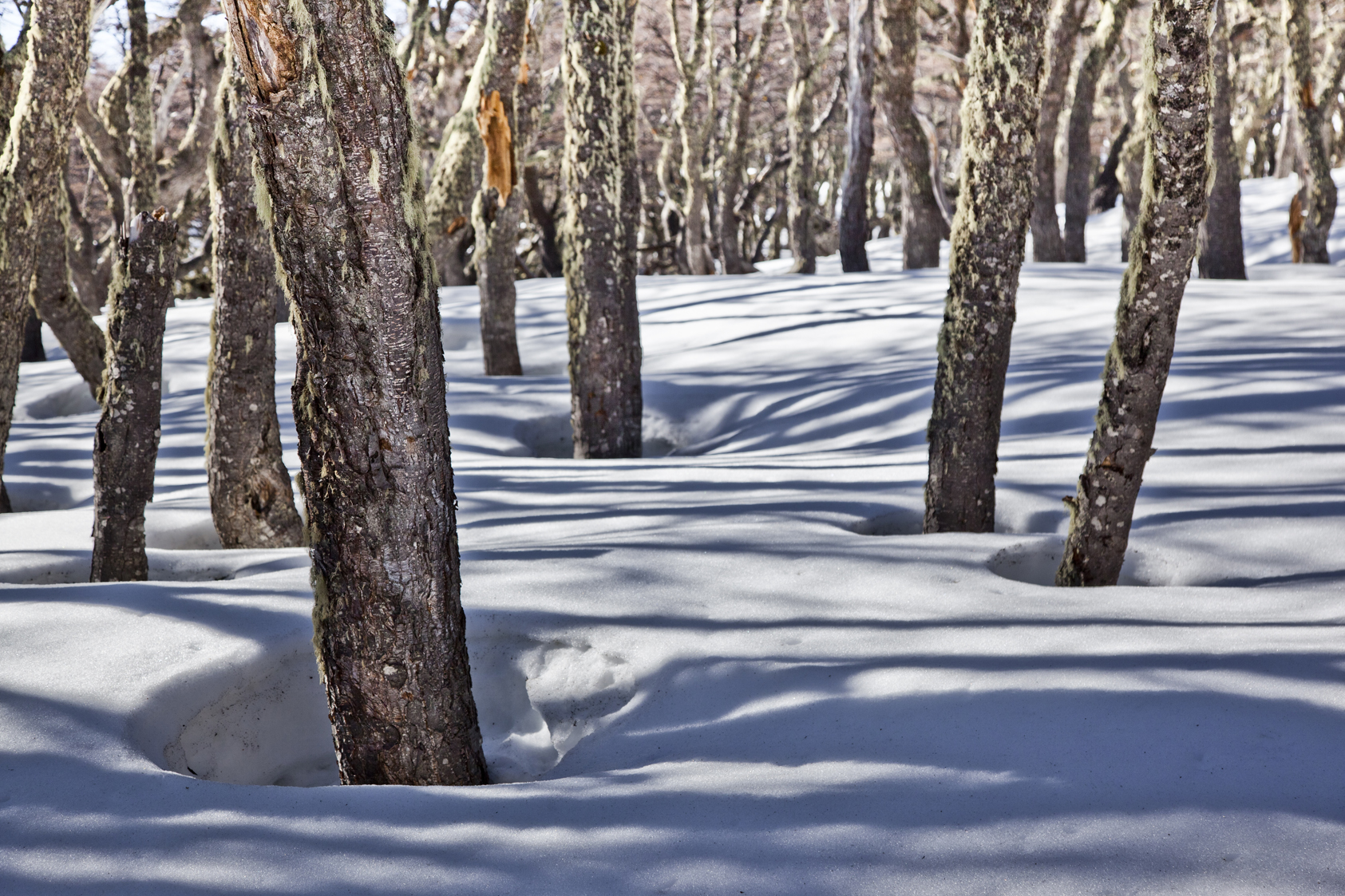 Thankfully the fire had not reached the entire mountain face. We soon rose into the cool shade of healthy open forest. Here the birds called, woodpeckers tapped and we chased footprints of fox in the snow. Underfoot our path was solid snow and ice, seldom would we stumble to our knees in a powdery path. A dazzling interplay of light and shade pulled our senses toward the forest floor, we grew immersed in the micro-beauty of the park hidden before the grandeur of the mountains.