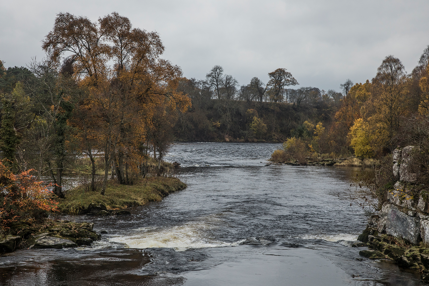 A short paddle across Loch Faskally brought us to Pitlochry where we passed our final dam with a short trolley across. Back on the banks of the Tummel, we eddied out and set off into the meandering flow toward Ballinluig. The river was faster flowing with occasional wave trains to bounce through. On the banks, autumnal rusted leaves fluttered orange in the breeze and a few of the less fortunate trees lay felled by the local beaver.