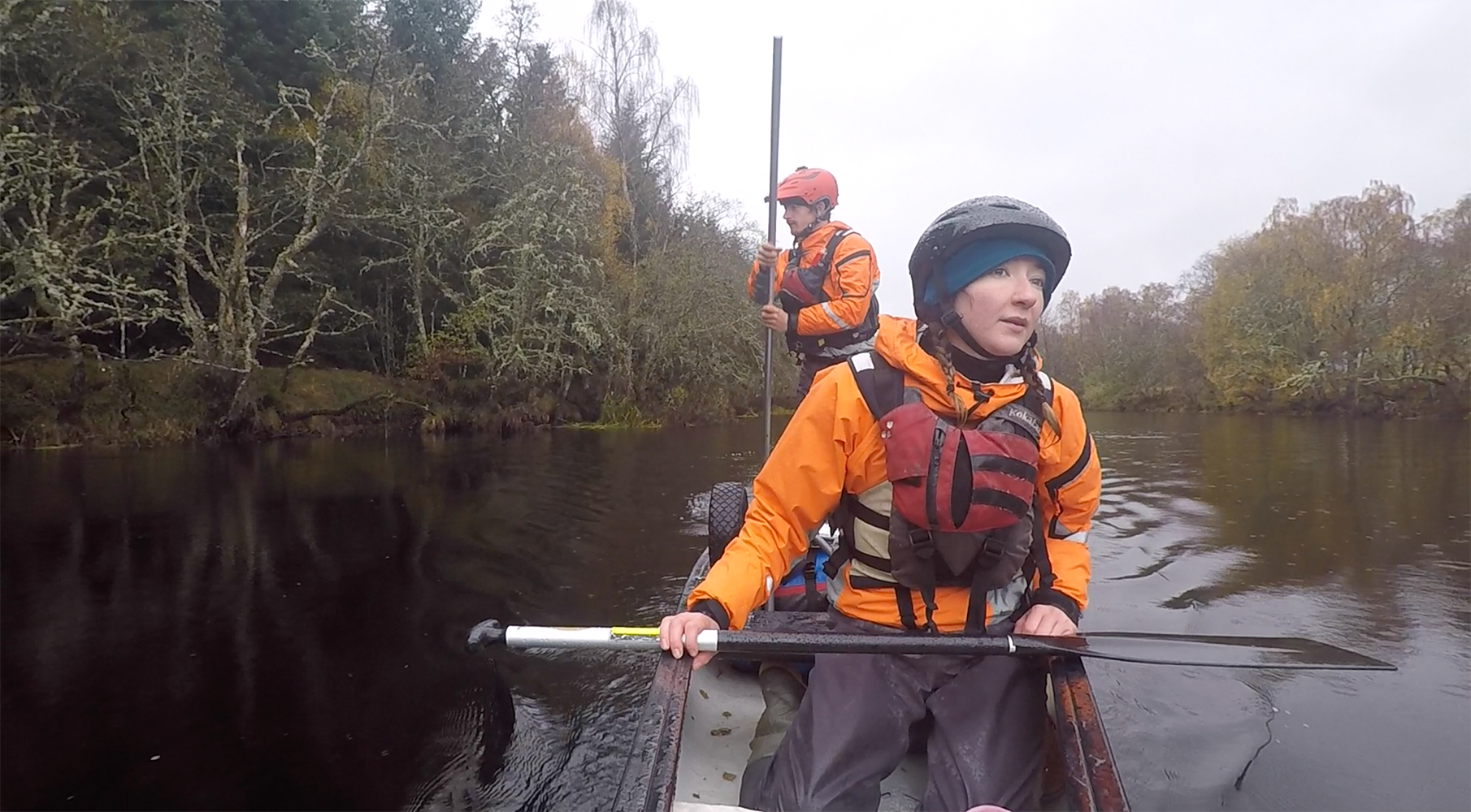The gentle metallic thuds of snubbed pole on rock rang through the silence of a misty morning as I guided us through the rapids toward Tummel Bridge. ‘Poling’ is the wonderful art of using a long (often metal) stick to control a canoe through shallow rapids. When moving downstream it is called ‘snubbing’. When possible we stowed aboard and paddled instead, splashing and whooping through trains of standing waves.