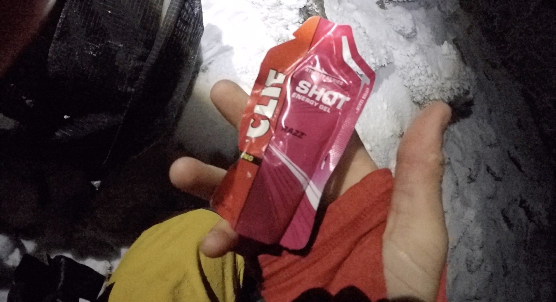 Loaded with winter gear and food for 5 days, we moved at a slow but steady pace up the ‘pony trail’ toward the summit. 22kg feeling every bit its weight on the long uphill. It was Jen’s first time with an expedition pack on, but she made swift progress at my side, fuelled on CLIF’s RAZZ gels, as we climbed together into the dark.
