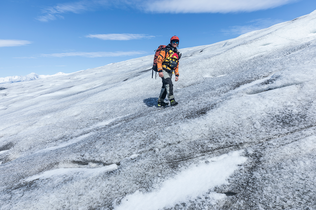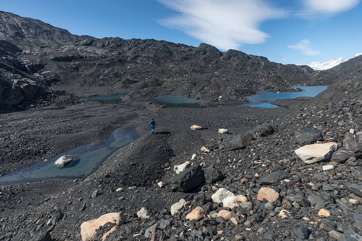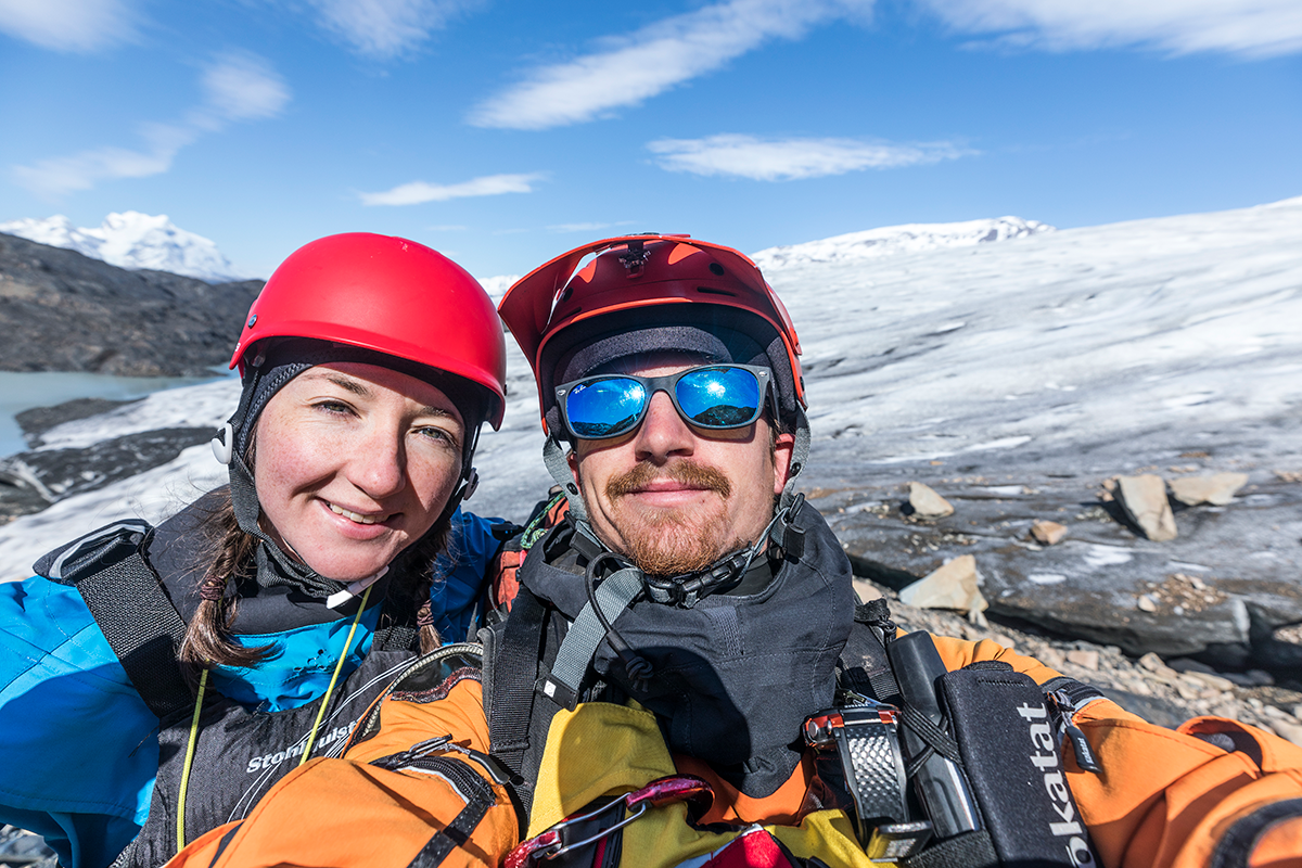 Our camp at the top of the river was well hidden in the trees and sheltered with a tremendous view and made a good spot to wait it out. By day three the conditions returned to perfection. This time we made it to the end of the lake and took the chance to scramble through the ice to wander on Jen’s first glacier. In the rapid retreat of the face, the landscape is left looking a lot like the surface of the moon, lifeless and black. Even in four years I have watched the ice go back here, there is even a lake that never used to be there now. All climate change deniers should be made to regularly inspect glaciers for a hobby.