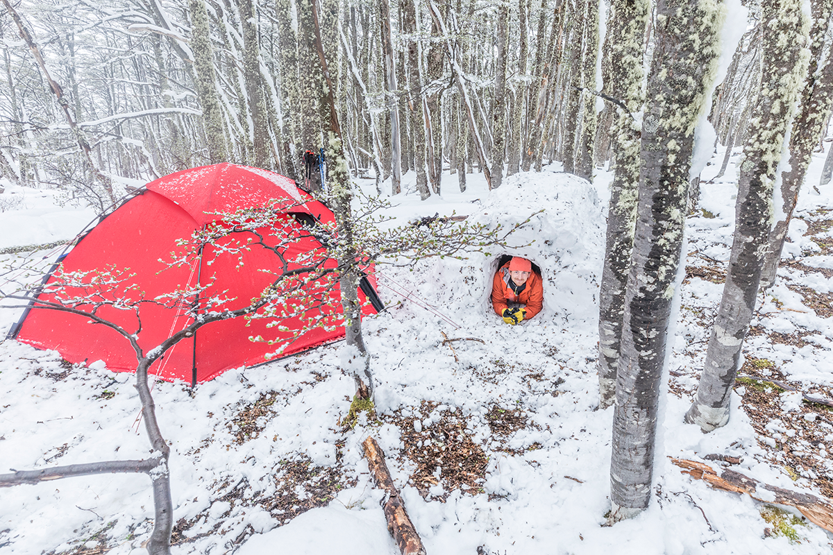By the time we reached the tree line the snow was 20cm deep, an unexpected addition to what we were expecting to be a snow free ascent. Discovering a level plateau in the forest we bunked down our tent for the night. It was only 3pm, so for the afternoon we spent time doing what any sensible person might do…building an igloo.