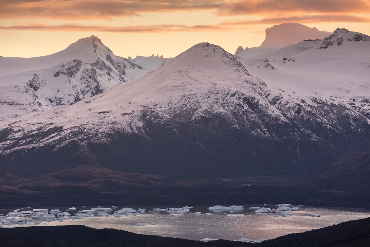 To our surprise at sunset the cloud cleared. We were treated to a spectacular view across Lago Tyndall, Lago Geike and Balmaceda (both filled with icebergs) and the greater ranges of peaks along the ice cap. A promising lead for the next day.