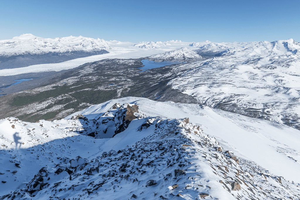 Toward the summit I followed a wonderfully alpine arete, which had wonderful exposure either side. Far below, the lakes and icebergs spread out in a tremendous panorama. I revelled in the knowledge we were probably the only ones in it at the time. Around 50m below the summit, I came across a barrier which was to be my turning point. A short scramble was cut off by a sheet of verglas, below which lay 600m of 60º slope. The verglas was unwise to pass solo over the scree and the scramble far too loose and broken to make a safe passage. While in summer or true winter conditions it would be easily passable, in what was presented it could not. This would be my top. The final 50m was sorely tempting, but a mountain view is remembered better alive. Of the Patagonian foothills which I have ventured in my time I have summited approximately 75% of them, most of which the final 100m has been the turn off. Sometimes for avalanche risk, others rock fall. Either way, the view from here was truly incredible. 50m off is close enough for me.