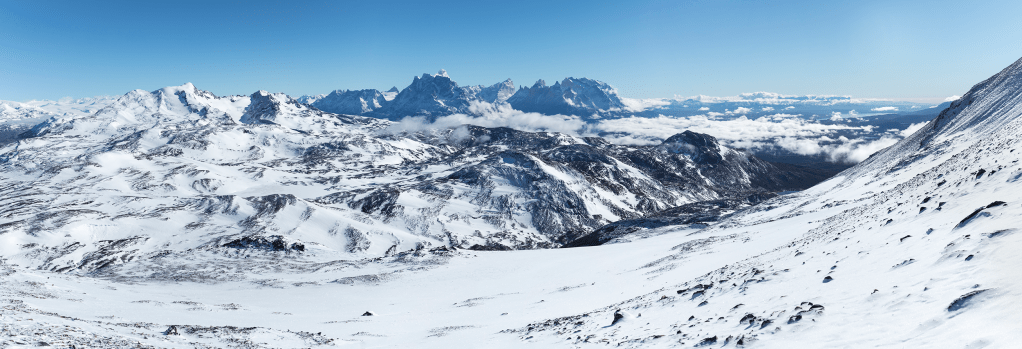 Jen opted to chill out and enjoy the view around 1000m while I pushed for the summit, less used to the terrain she was a little uncomfortable with the icy conditions given our remoteness and chose to make the sensible choice for her. Moving upward, I was soon in the sunshine. A spectacular vista across Torres Del Paine, which was under a small cloud inversion, was spread out before me. I picked my through the scree avoiding snow patches and sticking to the rock where possible. A breeze through the night had cleared the ridges from snow, but the scree was frozen together to a solid slab.